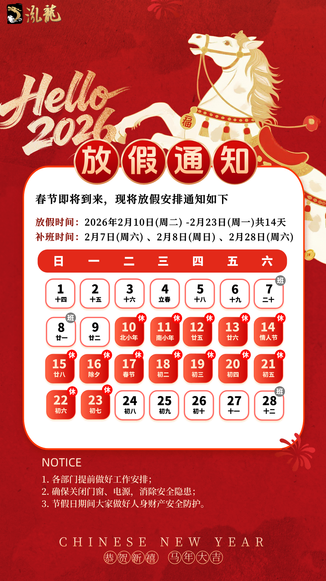 泓龙2026年春节放假通知